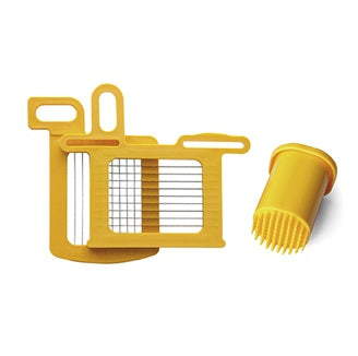 Este Set de Dynamic está fabricado en acero inoxidable, garantizando máxima higiene y durabilidad en entornos profesionales. Su rejilla permite cortar alimentos en cubos de 7 × 7 mm, dando cortes uniformes y consistentes tantos en verduras como en frutas blandas. El set está compuesto por la rejilla superior, la inferior y un empujador que facilita el control y seguridad durante el corte.