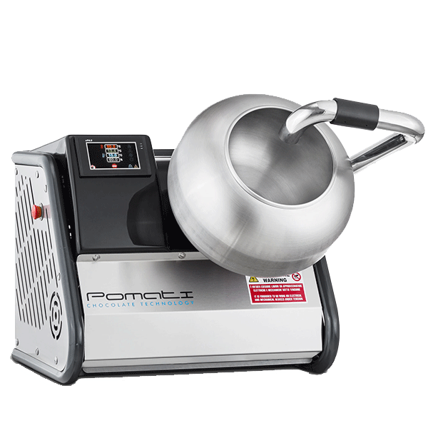 La temperatura, la velocidad y el sentido de rotación del contenedor se ajustan desde un panel de control con pantalla táctil, asegurando resultados consistentes y un manejo preciso. Versátil y confiable, es ideal para procesos de chocolatería artesanal y profesional.